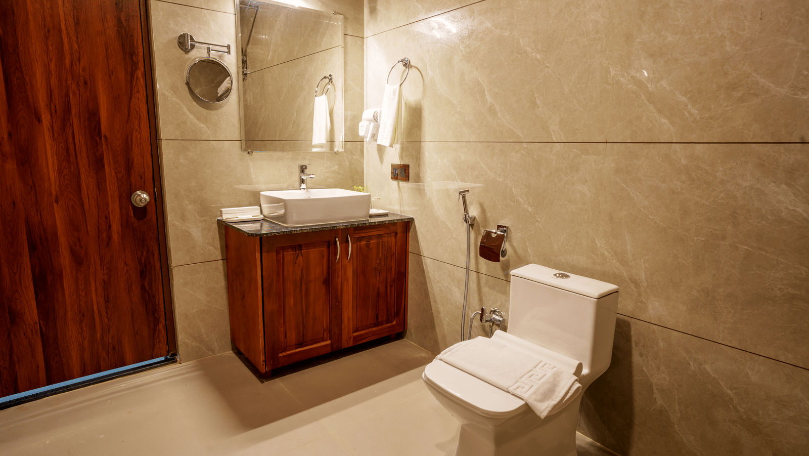 At 240 sq. ft., our thoughtfully appointed accommodation in Lamahatta is perfect for guests seeking a quiet retreat in the hills. Designed for two guests, it offers a king size bed, a real tree-log TV stand, and calming wooden finishes that create a relaxed, earthy ambience. Ideal for resting after a day of exploration or simply enjoying a slow evening indoors.